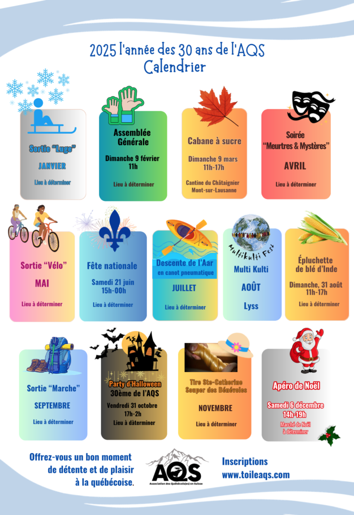 Venez nous rencontrez lors d’un évènementAssociation des Québécois(es) en Suisse Devenir MembreToute l’année Aventure en Luge25 janvier 2025 Assemblée Générale9 février 2025 Cabane à Sucre9 mars 2025 Meurtres et Mystères5 avril Sortie à Vélomai 2025 Saint-Jean Baptiste21 juin 2025 Descente de l’Aarjuillet 2025 MultikultiFestaout 2025 Epluchette de Blé d’Inde31 août 2025 Sortie « Marche »septembre 2025 Party d’Halloween31 octobre 2025 Souper des Bénévolesnovembre 2025 Apéro de Noël6 décembre 2025 Show All How it all worksDonec sagittis sagittis vestibulum. Morbi vestibulum neque. Expert TutorsEaque ipsa quae ab illo inventore veritatis et quasi architecto beatae vitae dicta sunt explicabo. Verified ProfilesEaque ipsa quae ab illo inventore veritatis et quasi architecto beatae vitae dicta sunt explicabo. Pay Per LessonEaque ipsa quae ab illo inventore veritatis et quasi architecto beatae vitae dicta sunt explicabo. Affordable PricesEaque ipsa quae ab illo inventore veritatis et quasi architecto beatae vitae dicta sunt explicabo. Why usLearn a new language online anywhere, anytime! Customized learningLorem ipsum dolor sit amet, consectetur adipiscing elit. Ut elit tellus, luctus nec ullamcorper mattis. Get expert help when you need itLorem ipsum dolor sit amet, consectetur adipiscing elit. Ut elit tellus, luctus nec ullamcorper mattis. Learn anytime, anywhereLorem ipsum dolor sit amet, consectetur adipiscing elit. Ut elit tellus, luctus nec ullamcorper mattis. About us » We prepare you to achieve your goals with professional tutors. « Lorem ipsum dolor sit amet, consectetur adipisicing elit, sed do eiusmod tempor incididunt ut labore et dolore magna aliqua. Read More Our success stories 5/5 « Lectus, nonummy et. Occaecat delectus erat, minima dapibus ornare nunc, autem. »Lily Granger 4/5 « Lectus, nonummy et. Occaecat delectus erat, minima dapibus ornare nunc, autem. »Jeson Foxx 5/5 « Lectus, nonummy et. Occaecat delectus erat, minima dapibus ornare nunc, autem. »Ron Burnwood 4/5 « Lectus, nonummy et. Occaecat delectus erat, minima dapibus ornare nunc, autem. »Judy Sewell 4/5 « Lectus, nonummy et. Occaecat delectus erat, minima dapibus ornare nunc, autem. »Anne Mcfadden Choose a teacher for 1-on-1 lessonsStart learning a new language today!Read More